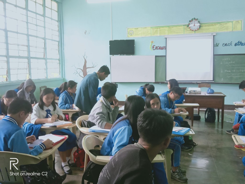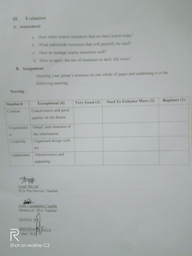 On Tuesday, 27 august 2019 was the day where my heart beat so fast since it was my first teaching day. I prepared everything for teaching 2 grades they were 9-3 and 9-1. At 8.45 until 9.45 I taught in grade 9-3 the first material was about Scarcity. I explained it by using power point and the students in this class was very active so that I did not find any difficulty. Then, at the end of the meeting I gave them assesement related to its materials, after that I divided them into 5 groups to draw natural resources mapping on A4 paper and should be submitted in the following meeting. After an hour teaching time showed me 9.45 and it’s morning break for 15 minutes. I just stayed in SEA Teacher’s office with my friends to prepare next class since I had to go to grade 9-1 at 11.00 until 12.00 still in the same material as grade 9-3. Students of grade 9-1 was very active too so that I could explain the material easily. I gave them assesement and assignment same as grade 9-3, the difference is only they were not divided into group, but a pair as they requested. There were 16 piars and each pair should draw philippines’ regions on a white big paper and they should submit in the following meeting. Amazingly, their works were incredible and I brought 1 drawing to Indonesia.